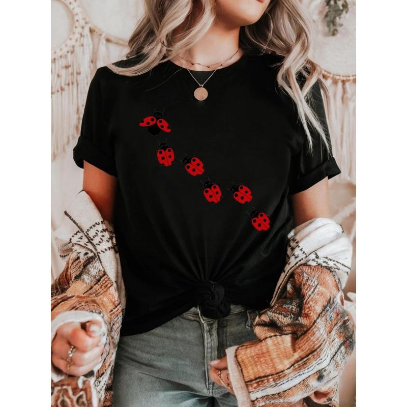 Women's Y2K Slim Fit Solid Color Short Sleeve T-Shirt Red Ladybug Print Casual Crew Neck Pullover Top