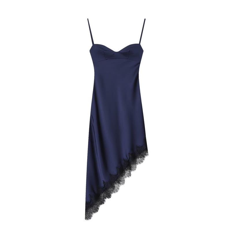 This elegant dress combines European and American fashion aesthetics, featuring an asymmetrical lace design that adds a modern twist to classic elegance. The slip dress is crafted from high-quality polyester silk satin, offering a luxurious sheen and a soft, smooth texture. Ideal for both formal occasions and stylish evenings out, its sophisticated silhouette and premium materials ensure comfort and style in every wear.