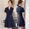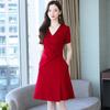 This dress captures timeless sophistication with its classic A-line silhouette and flattering V-neck design. The short sleeves add a touch of elegance, while the waist-cinch detail enhances your natural shape. Crafted from a polyester-spandex blend, it offers a comfortable fit and a graceful drape.