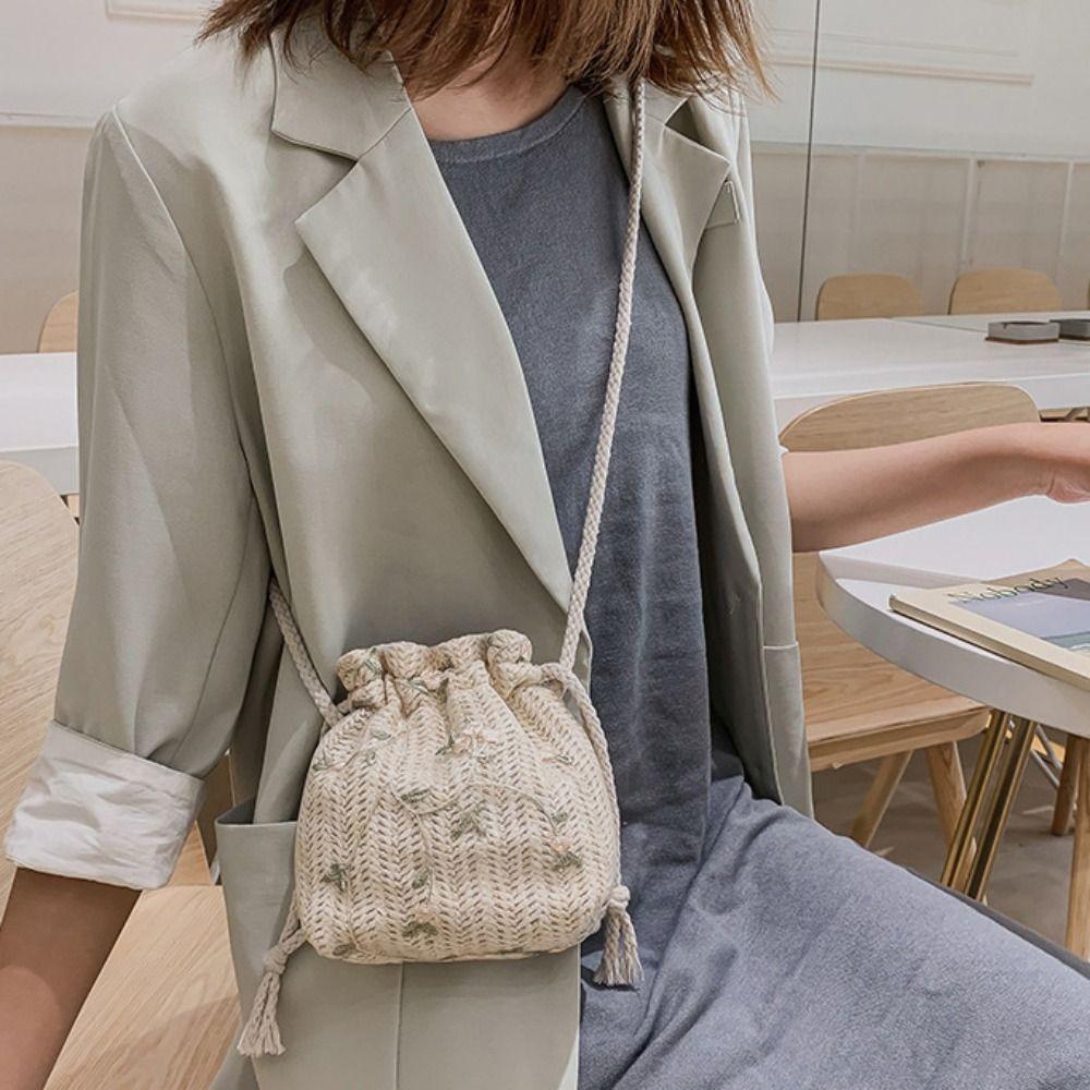 Elegant Straw Bag Lace Woven Beach Bag Leisure Drawstring Bucket Bag Vacation