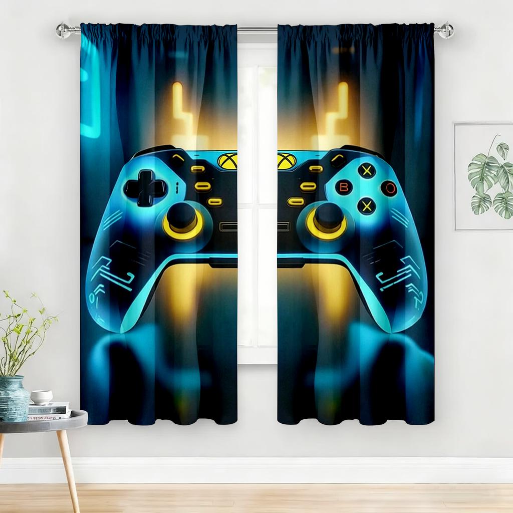 2PC Blue & Yellow Gaming Controller Curtains - Futuristic Neon Print Window Drapes for Boys Bedroom Game Room Decor