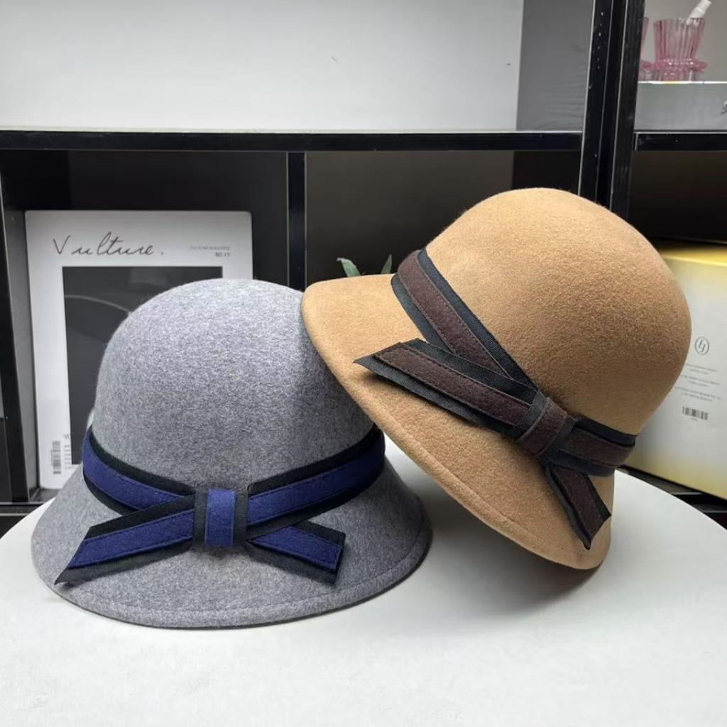 Hepburn style autumn and winter contrasting color bow versatile pure wool hat women's basin hat French top hat felt hat