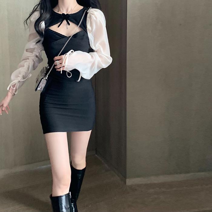 Women's Spicy Lace-up Puff Sleeve Patchwork Dress - Spring/Autumn Slim Fit Short Skirt