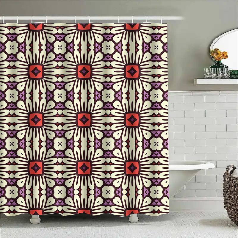 Vintage Geometric Shower Curtain with Purple, Red, Black, White Pattern Polyester Fabric for Bathroom Decorations. This descript