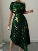 Asymmetrical Shoulder Gold Foil Pleated Dress for Women