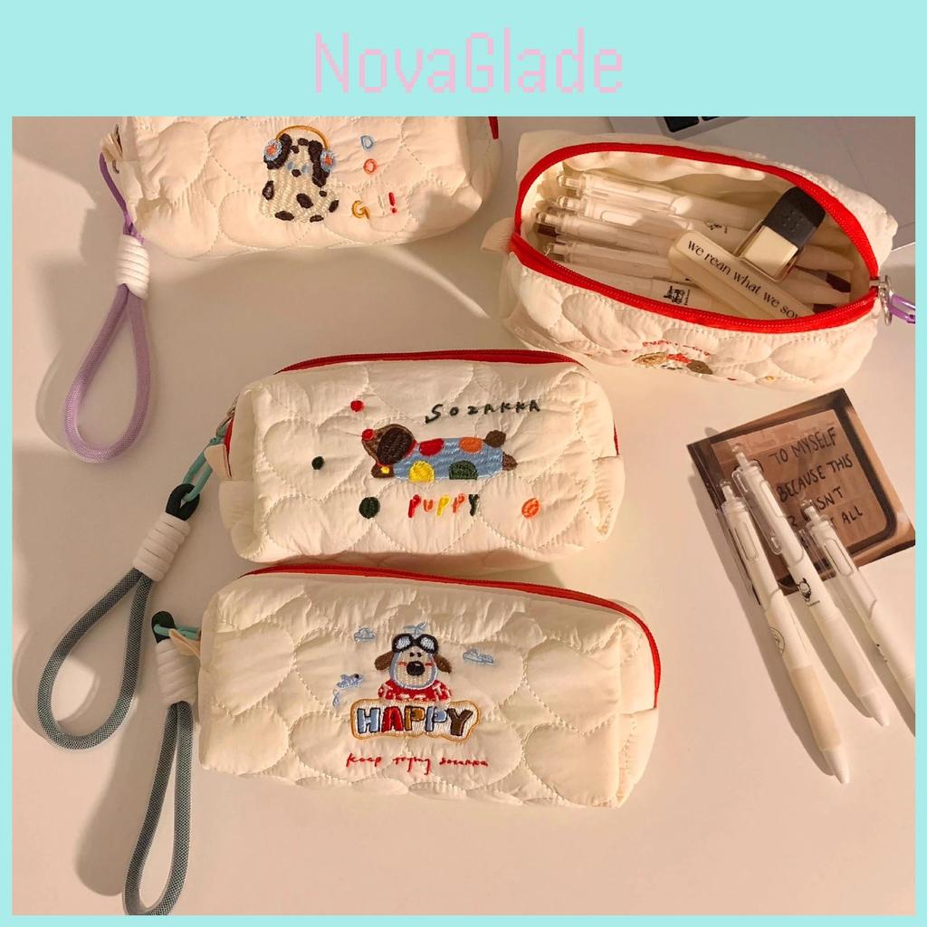 This cartoon embroidered dog pencil case features a spacious design made from durable nylon material, measuring approximately high. Its large capacity supports storing stationery, accessories, or small personal items effectively. Designed in a stylish Korean-inspired aesthetic, it suits students and professionals alike. Ideal for school, office, or travel use, it allows for organized storage of pens, pencils, and more. Wipe clean with a damp cloth to maintain its vibrant appearance.