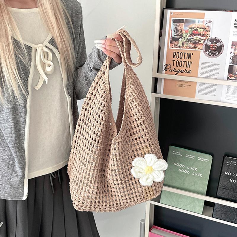 Solid Color Knitting Shoulder Bag Flower Large Capacity Bohemian Crochet Tote Bag Hollow Out Versatile Casual Woven Handbag
