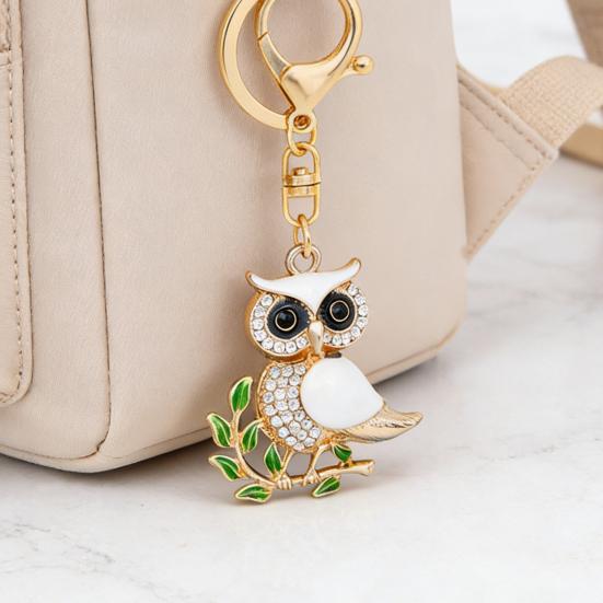 This exquisite owl key chain symbolizes wisdom, smoothness, and safety, making it an ideal gift for birthdays, graduations, and holidays. Crafted with colorful enamel glaze available in black, white, purple, and more, the owl features vivid green branches and leaves adorned with sparkling rhinestones that catch the light beautifully. Its three-dimensional design highlights big eyes perched on a branch, embodying intelligence and artistic charm.