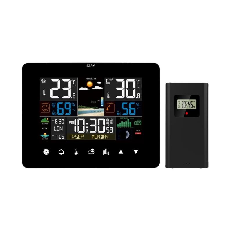 Color touchscreens weather stations with wireless outdoor sensors offer 12 hour weather forecasting, multilanguage weekday display, and customizable alarm, perfect for home weather monitoring and indoor outdoor temperature/humidity tracking.