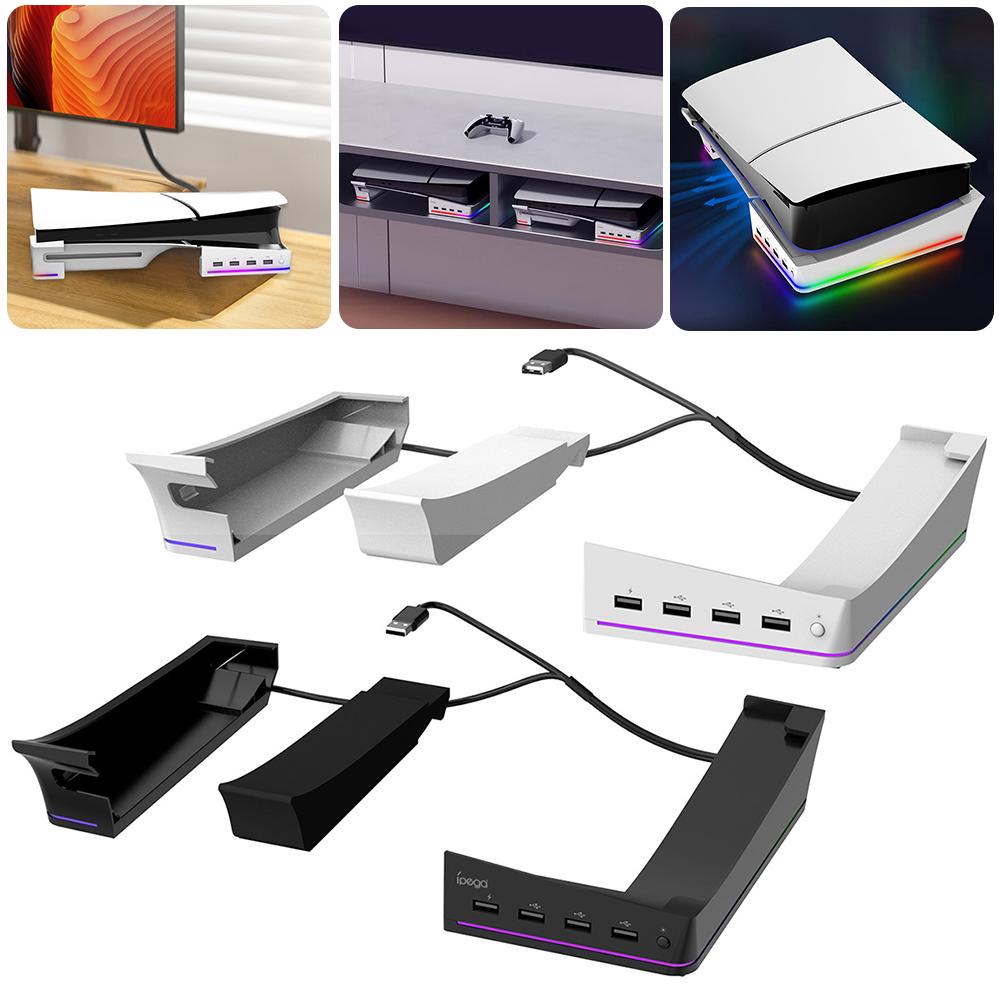 Horizontal Game Console Base Stand Holder with 14 Light Mode and 4 USB Hubs Game Console Desk Stand Storage Rack for PS5 Slim