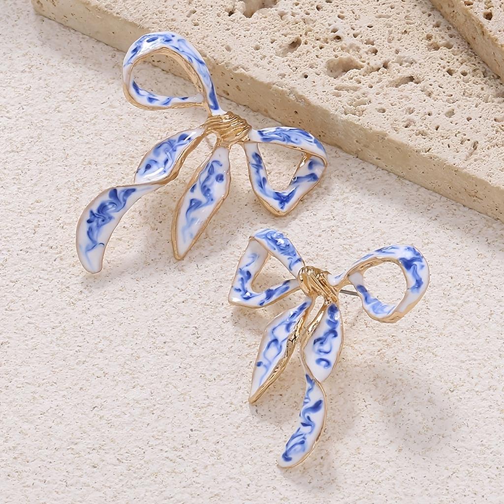 2pcs Fashionable and Elegant Bow-Shaped Earrings with a Simple Blue and White Porcelain Pattern Design.