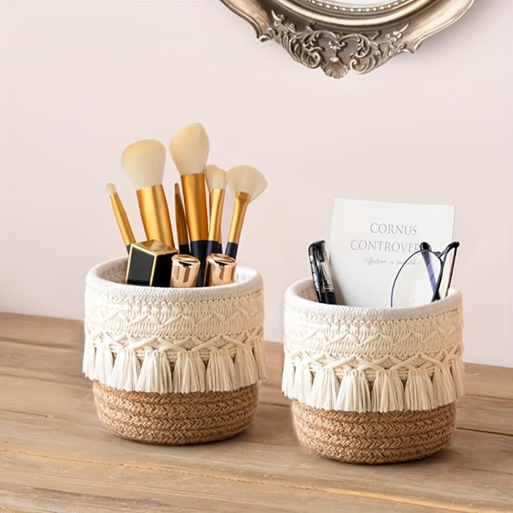 1pc Round Woven Cosmetic Storage Basket,Makeup Brush Holder, Cute Vanity Organizer Box for Home Decor,Ideal for Storing Pencils