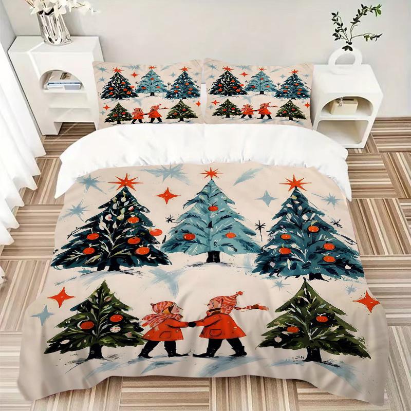 3pcs Christmas Tree in the Snow Bedding Set, 1 Soft Quilt Cover + 2 Pillowcases, Machine Washable, Suitable for All Seasons