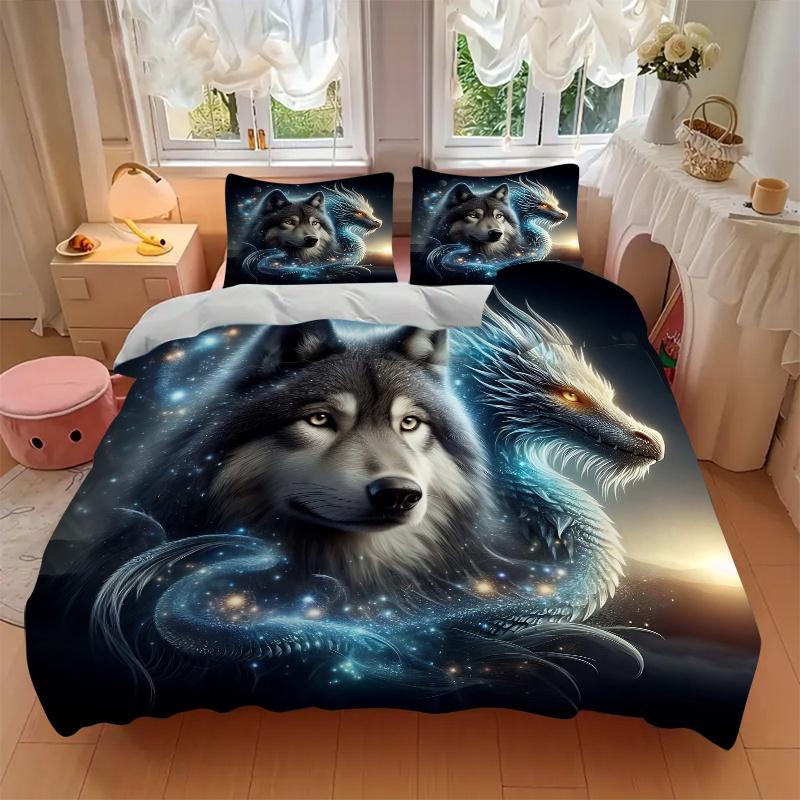 3pcs Galactic Wolf Dragon Print Cover Set Ultra Soft, Breathable, and Comfortable Bedding with Stylish Design for Bedroom and Guest Room Decor