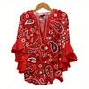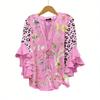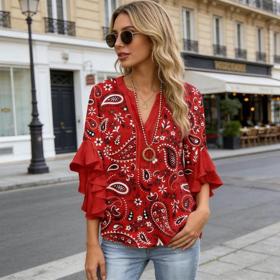 Bohemian Blouse Design: Featuring authentic floral patterns and a loose tunic cut, this blouse flatters all body shapes while embracing a sophisticated bohemian aesthetic. The ruffled sleeve design adds a feminine touch perfect for summer wear and relaxed beach settings.