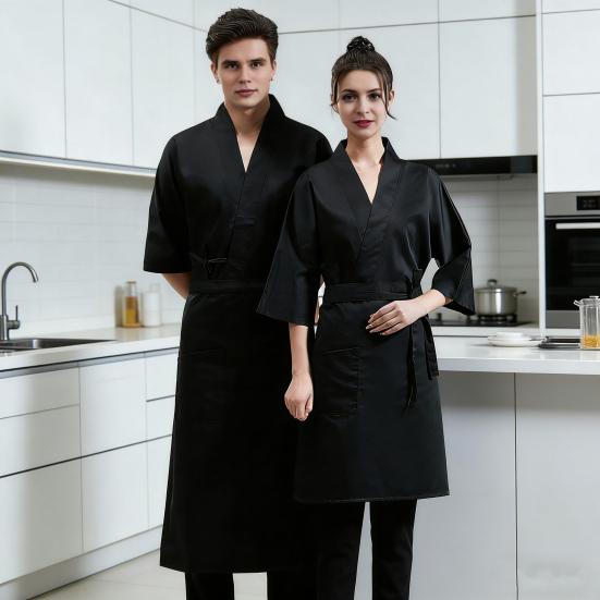 Modern-Traditional Fusion Aesthetic: Combining traditional kimono-inspired elements with contemporary professional wear concepts, this chef jacket elevates the visual appeal of any culinary environment. Perfect for upscale restaurants, Japanese food venues, spas, or other service industries, it enhances the overall ambiance while maintaining full functionality.