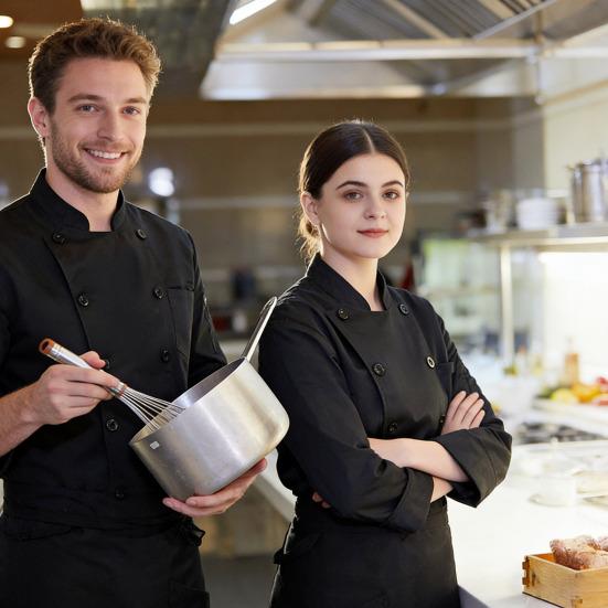 Functional Stand Collar: Featuring a high stand collar design, this chef jacket provides enhanced protection by preventing oil splashes and food particles from reaching the neck area. This practical detail not only boosts hygiene but also adds a sharp, professional look to your kitchen attire.