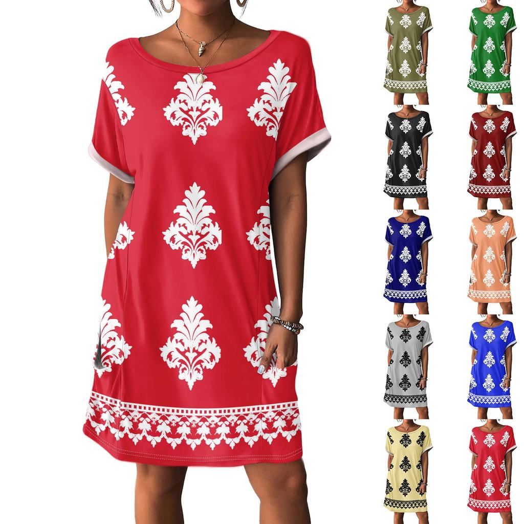Women's Fashion Short Sleeve Dress With Pockets Floral Print Casual Beach Dress