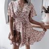 Kadın Yazlık Elbise Çiçek Baskılı V Yaka Kısa Kollu A Kesim Fırfırlı Pileli Şık