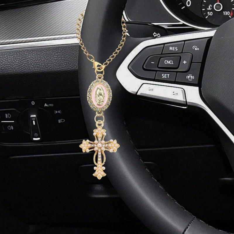 1pc Steering Wheel Decor - With Virgin Mary Pendant And Diamond Cross Steering Wheel Accessory, Multi-Color Options; Catholic Pendant, Car Accessories