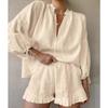 Kadın Yaz Seksi Bağcıklı Yüksek Bel Moda Düz Renk Bol V Yaka Fener Kol Şort İki Parça Takım