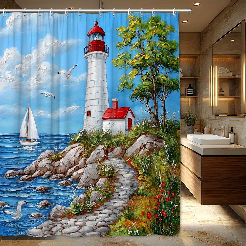 1pc Ocean Landscape Lighthouse Shower Curtain Polyester Fabric Bathroom Decor Beach Scene Sailboat and Seagulls Design Bath Tu