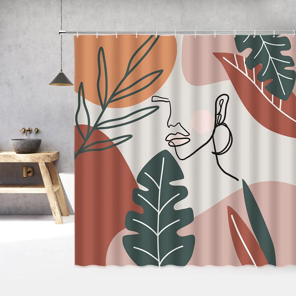 Modern Abstract Face Shower Curtain, Simple Female Silhouettes Pastel Colors Line Color Bath Curtain for Bathroom with Hooks