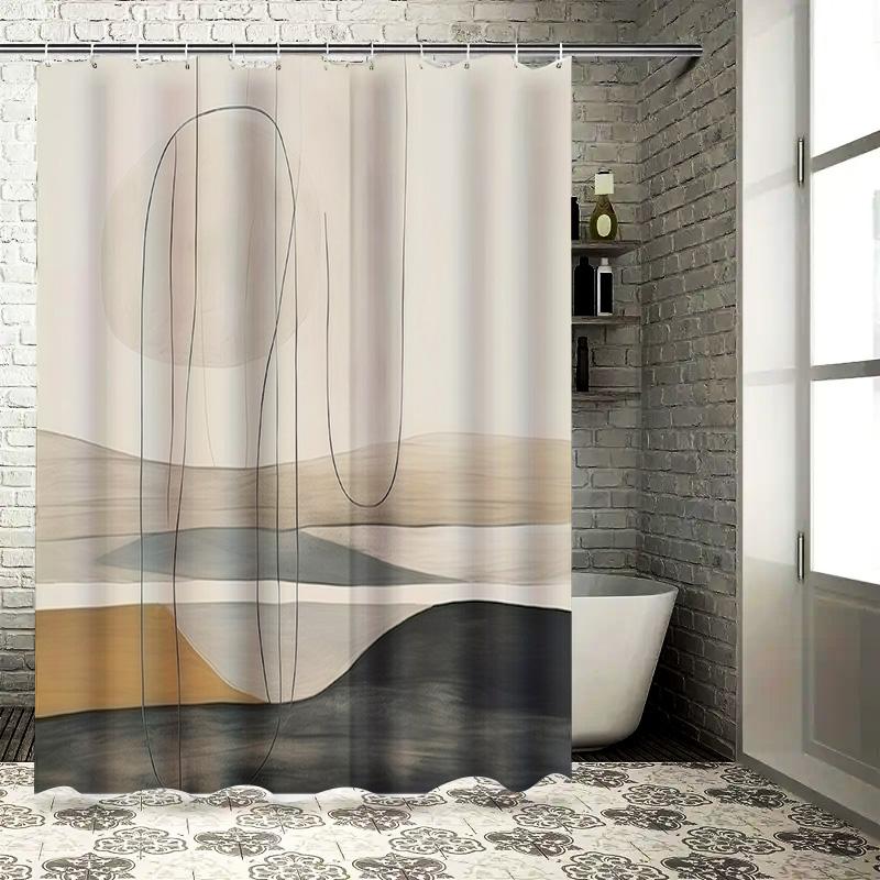 Minimalist Modern Bathroom Shower Curtain Set with Geometric Print Decorative Hanging Rod Included (Black Beige)