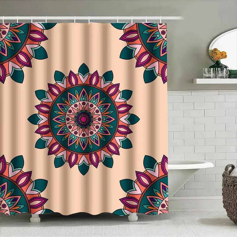 Colorful Mandala Shower Curtain Decor Peach Background with Pink, Green, Blue Floral Design Waterproof Fabric Bathroom Hanging S