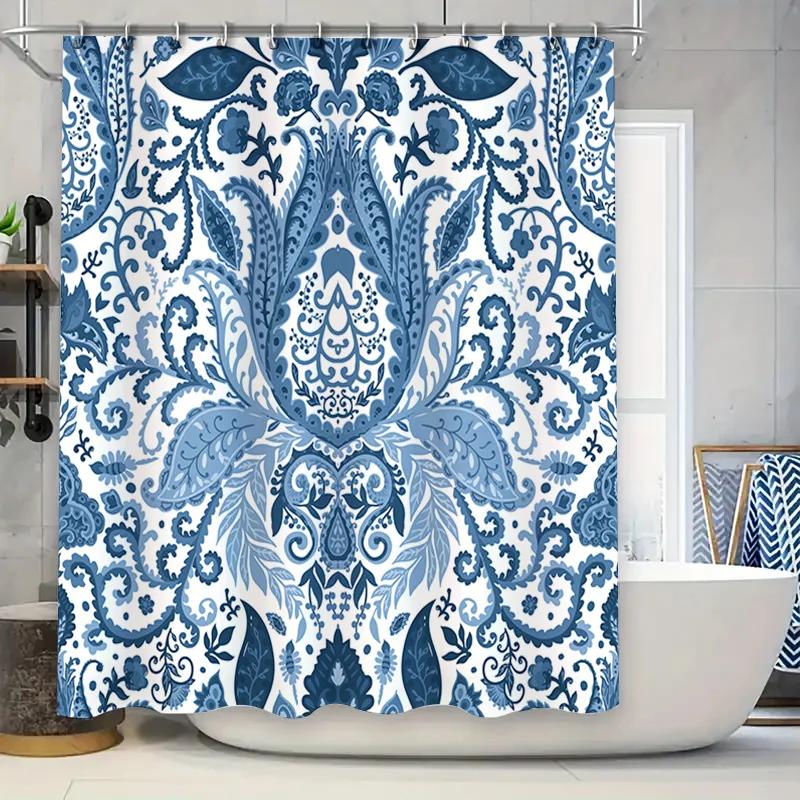 Vintage Blue White Floral Shower Curtain for Bathroom Decor Waterproof Fabric Bath Mat Cover with Grommets Holes 72x78 In (183X2