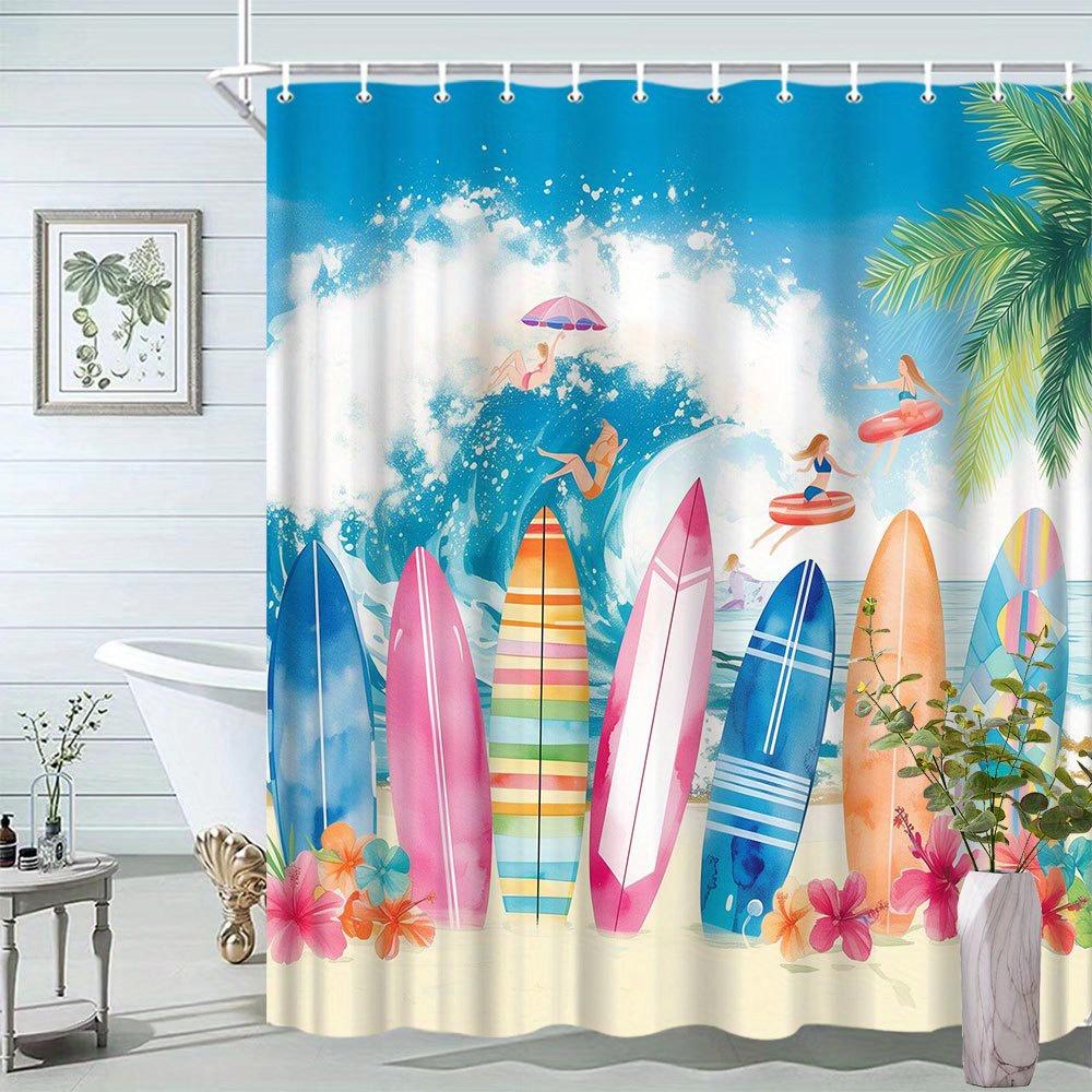Beach Surfing Theme Shower Curtain - Creative Colorful Surfboard & Tropical Waves, Cute Female Surfer, Polyester Bathroom Decor