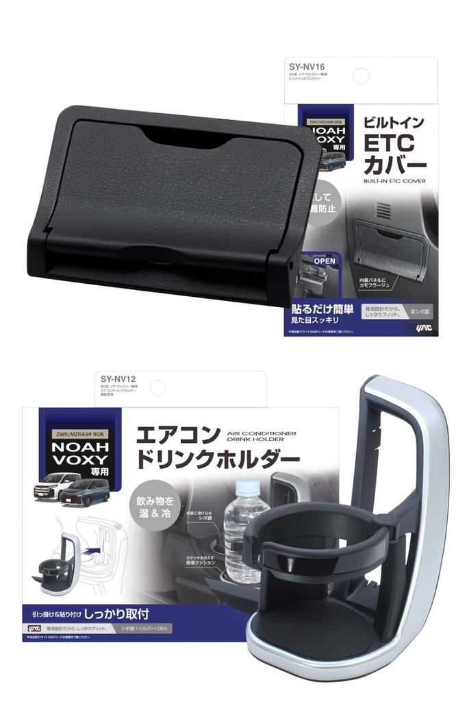 SY-NV12 90 Series Noah/Voxy Dedicated Air Conditioner Drink Holder, Driver's Side Product Description This product is specifically designed for right-hand drive Noah/Voxy (ZWR/MZRA9#) vehicles. Its dedicated design ensures a perfect fit on the driver's side air conditioner vent panel. The air conditioner's airflow helps to keep drinks warm (when using hot air) or cool (when using cold air). Easy installation: simply hook the tabs and attach with double-sided tape. Does not obstruct the movement of the air conditioner fins. Includes a bottom cushion to prevent drinks from rattling. Can hold slim cans, 350ml cans, 500ml/600ml PET bottles, convenience store coffee, etc. May not be compatible with vehicles that have undergone minor changes since the survey date (as of December 2021). Cannot be installed on vehicles with additional options installed around the mounting area of this product. SY-NV16 90 Series Noah/Voxy Dedicated Built-in ETC Cover Product Description This product is specifically designed for right-hand drive Noah/Voxy (ZWR/MZRA9#) vehicles. Its custom design ensures a perfect fit within the panel where the ETC unit is installed. Because it conceals the ETC unit, it's ideal for theft prevention. When inserting or removing the ETC card...