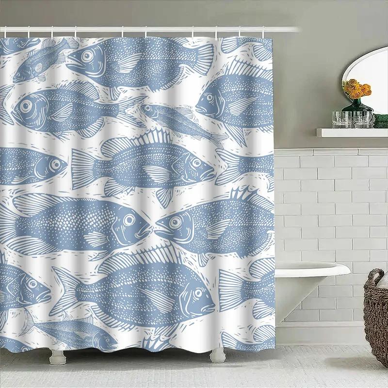 Blue Fish Shower Curtain Decorative Bathroom Waterproof Fabric Bath Mats for Home Decoration White Blue Floral Pattern Watercolo