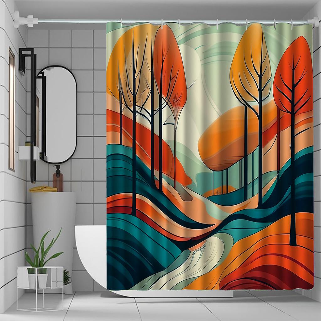 Elegant Polyester Shower Curtain - Vibrant Abstract Tree Design,Rich Palette of Orange, Red, Green & Blue, All-Season Bath Decor