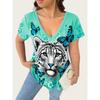 Women's Summer Short Sleeve T-Shirts V-Neck Tiger Printed Shirts Loose Plus Size Pullover Tops