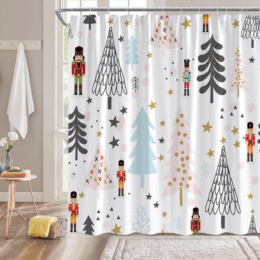 Funny Gray Blue Pink Xmas Tree Christmas Shower Curtain, Waterproof Winter Holiday Bathroom Decor for Seasonal Festival
