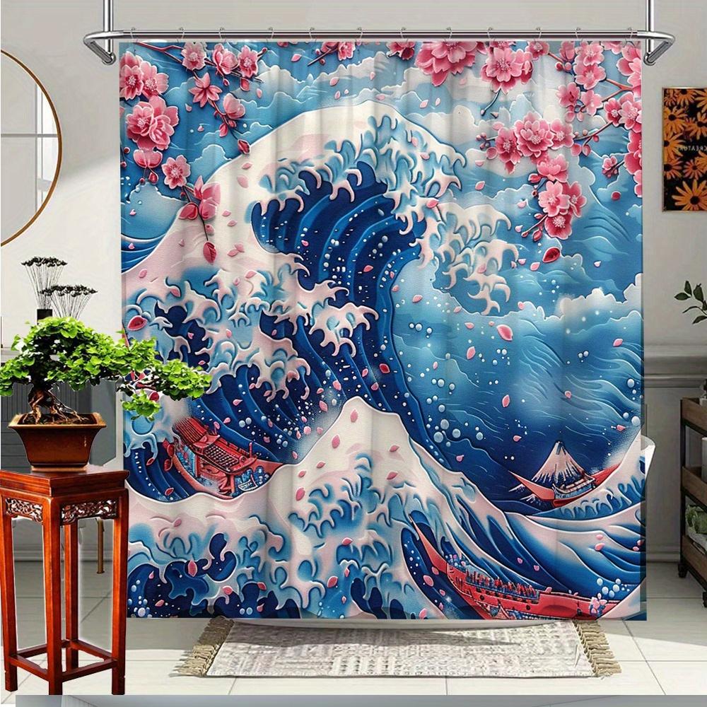 1pc Cherry Blossom Wave Shower Curtain - Stunning Japanese-Inspired Bathroom Decor, Polyester Fabric with 12 Hooks,
