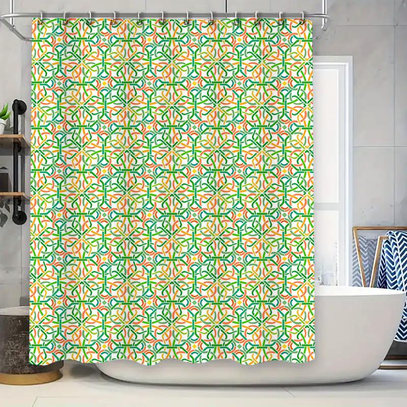 Vibrant Interlocking Geometric: Orange and Green Pattern Shower Curtain for a Modern and Energetic Bathroom Décor
