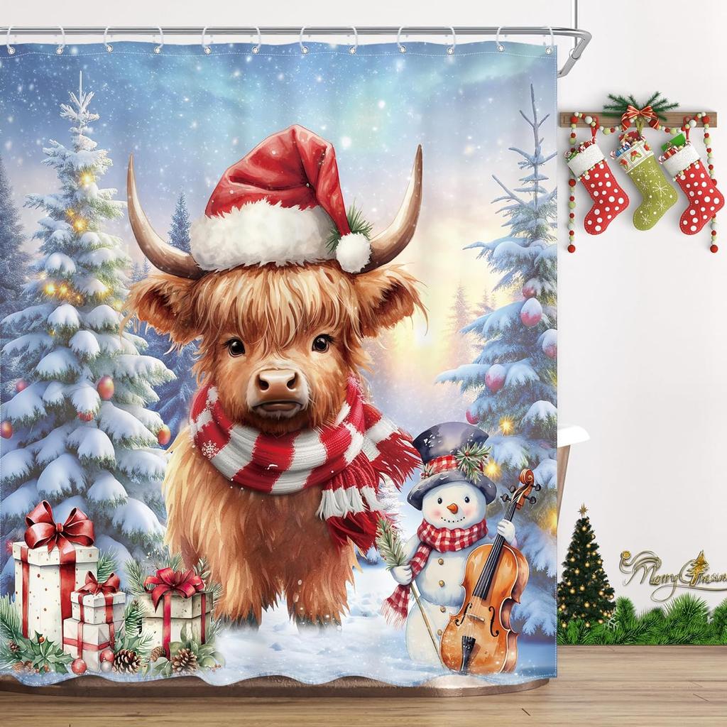 Christmas Highland Cow Shower Curtain Snowman Violin Gift Tree Design Holiday Theme Festive Decor Waterproof Fabric Xmas
