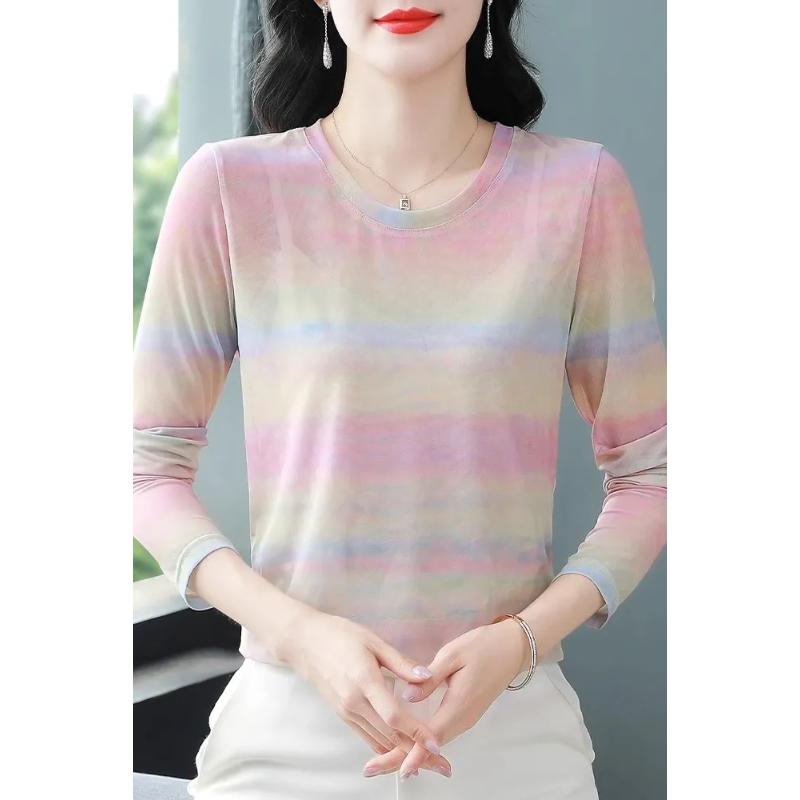 Women's Spring Summer Gradient Striped Mesh Long Sleeve Top Casual T-shirt