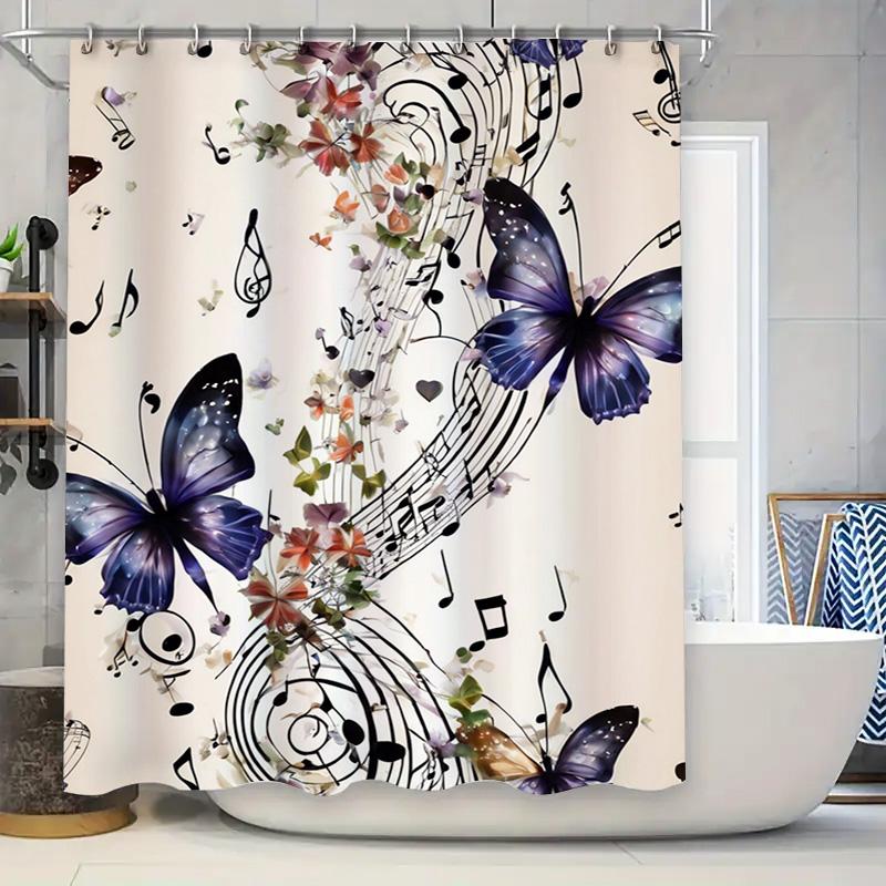 Modern Flower Music Note Shower Curtain for Bathroom Decor Black Butterfly Design, Waterproof Fabric, Perfect Gift Idea (White)