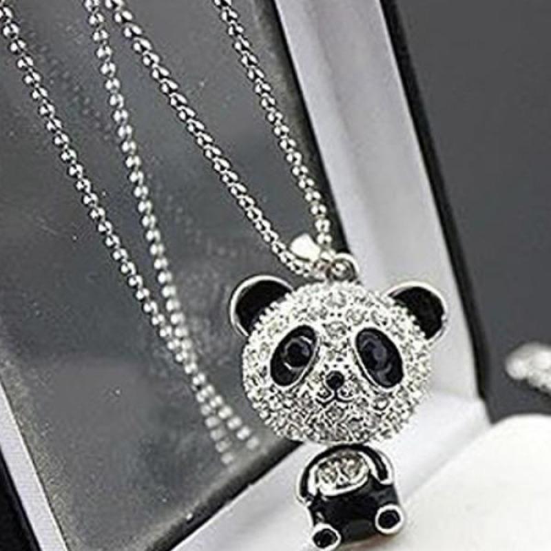 Women Fashion Lovely Rhinestone Panda Pendant Beaded Long Sweater Chain Necklace