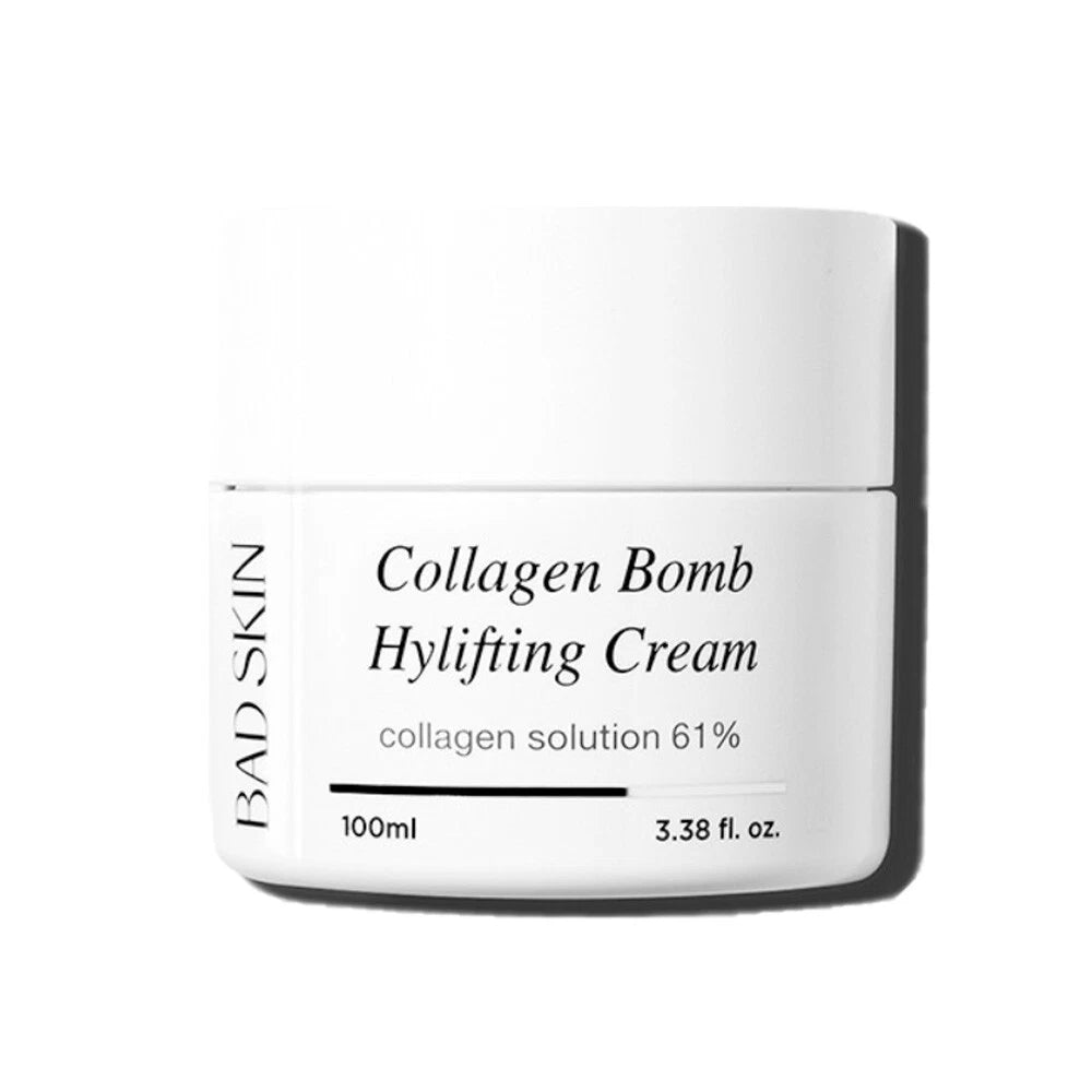 BADSKIN Collagen Bomb Hylifting Cream combines 61% Hydrolyzed Collagen, Volufiline, and nine peptides to deeply nourish and hydrate dry, sagging skin. It enhances skin elasticity and promotes regeneration while Niacinamide brightens the complexion. Formulated with EWG green-graded ingredients, it creates a lasting moisture barrier using Hyaluronic Acid and Shea Butter. The cream?'s dense yet silky texture ensures excellent adherence with a non-sticky, smooth finish, supporting skin health throughout the day.