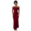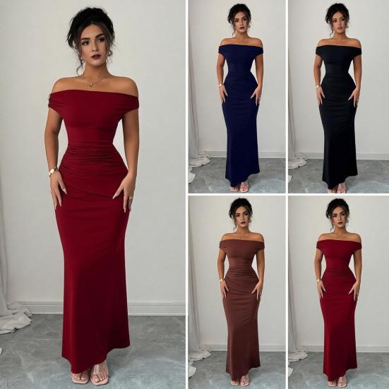 The stylish off-shoulder design features a unique metal buckle on the shoulder, highlighting feminine charm by exposing the collarbone and shoulder lines. Its slim-fitting, hip-hugging cut with a high waistline accentuates curves and elongates legs for a sexy hourglass figure. Simple yet sophisticated pleats and metallic details add subtle luxury, making this dress perfect for formal events or elegant evenings.