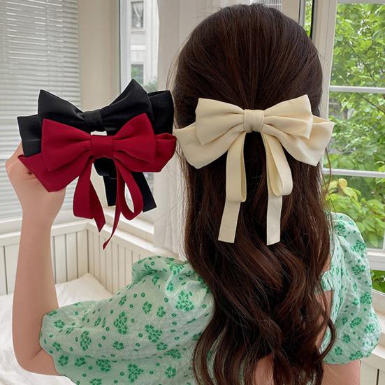 This elegant hairpin features a large, three-dimensional bow meticulously folded and sewn by hand, showcasing full layers and refined craftsmanship. Made from smooth, crisp satin fabric, it offers a soft, shiny texture that resists wrinkles and hair pulling.