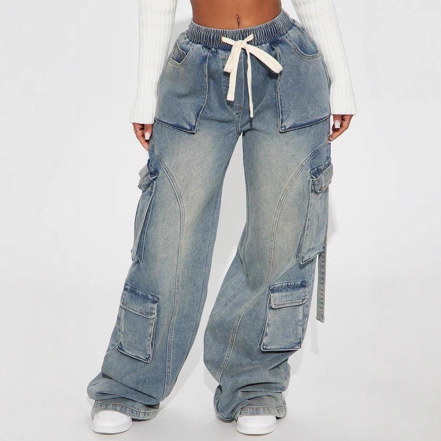 Women's Y2K Loose Fit Wide Leg Jeans Multiple Pockets Elastic Waist Denim Trousers Casual Pants