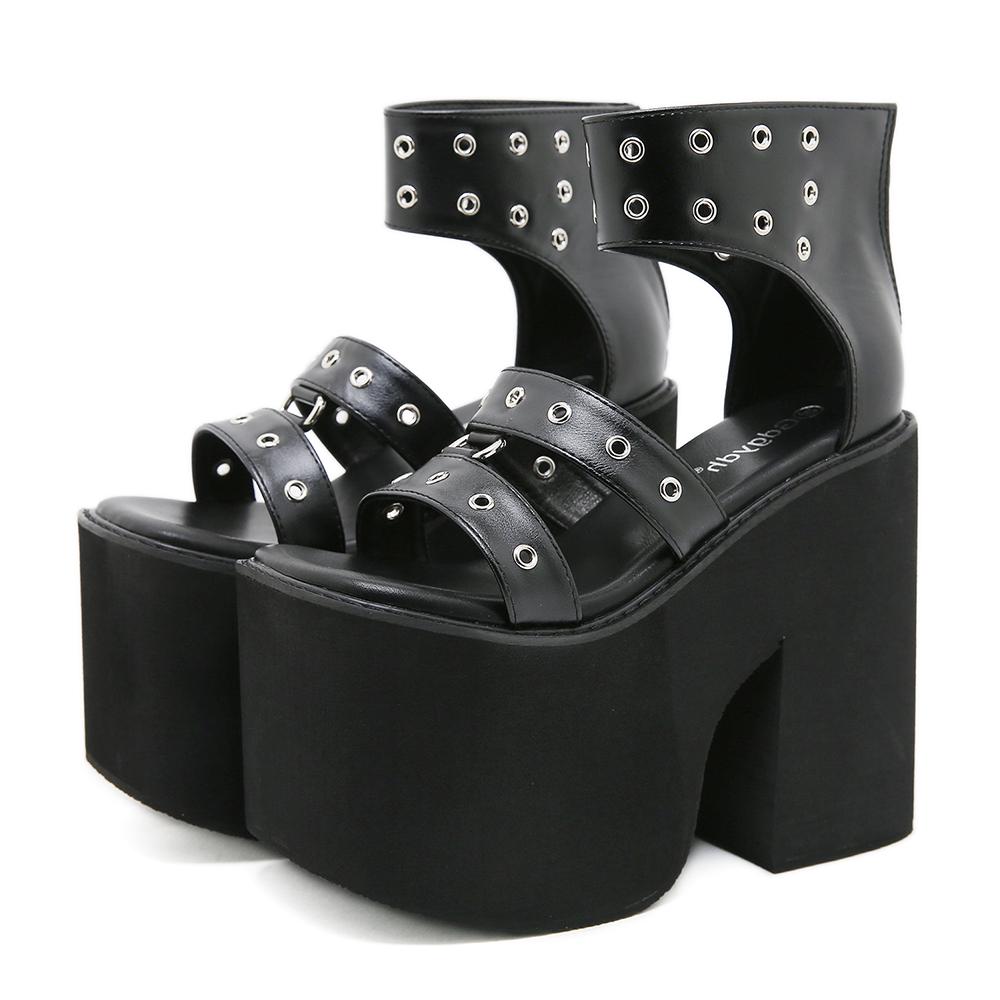 Gdgydh Black Punk Gothic Platform Sandals Open Toe Buckle Strappy Sexy Rivets Thick Heels Footwear Summer Shoes for Women