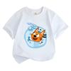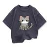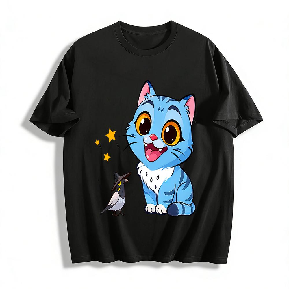 Cute Blue Cat & Hat-wearing Bird Print Casual Top Kids Boys Girls Breathable Daily T-shirt Pure cotton T-shirt