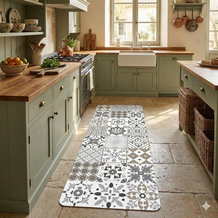 Tapis de cuisine décoratif - EDEN - Motif carreaux ciment - 45 x 120 cm - Gris - Mousse PVC antidérapante