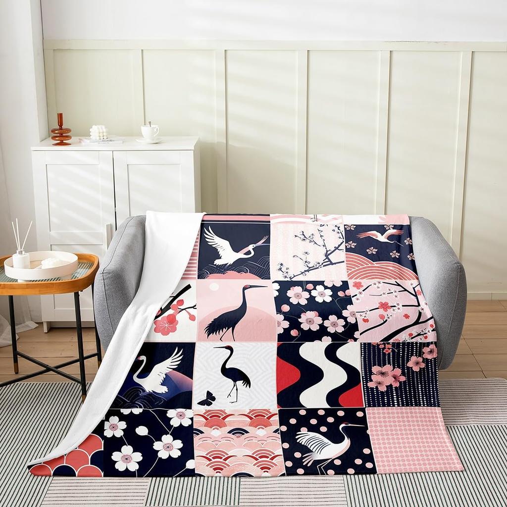 Japanese Style Blanket White Black Crane Throw Blanket Cherry Blossoms Fleece Twin Geometric Plaid Fuzzy Blanket All